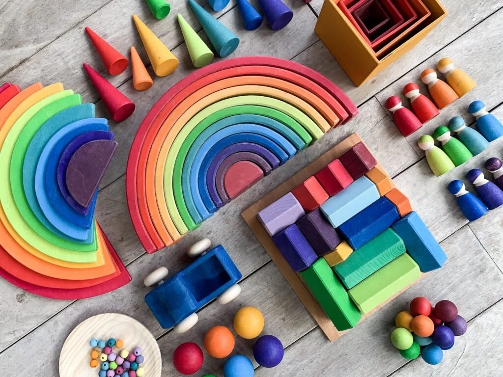 德國 Grimm’s 開放式多彩積木,是公認最能代表「華德福教育精神」的經典玩具之一。它以天然木材手工打造,保留溫潤木紋與自然觸感,再搭配鮮豔卻柔和的彩色染料,每一組積木都像是藝術品,兼具實用與美感。最特別的是 Grimm’s 沒有固定玩法,也沒有制式的拼搭範例,它強調「開放式遊戲」,讓孩子自由去疊高、搭橋、拼圖、建構城堡或幻想中的場景。