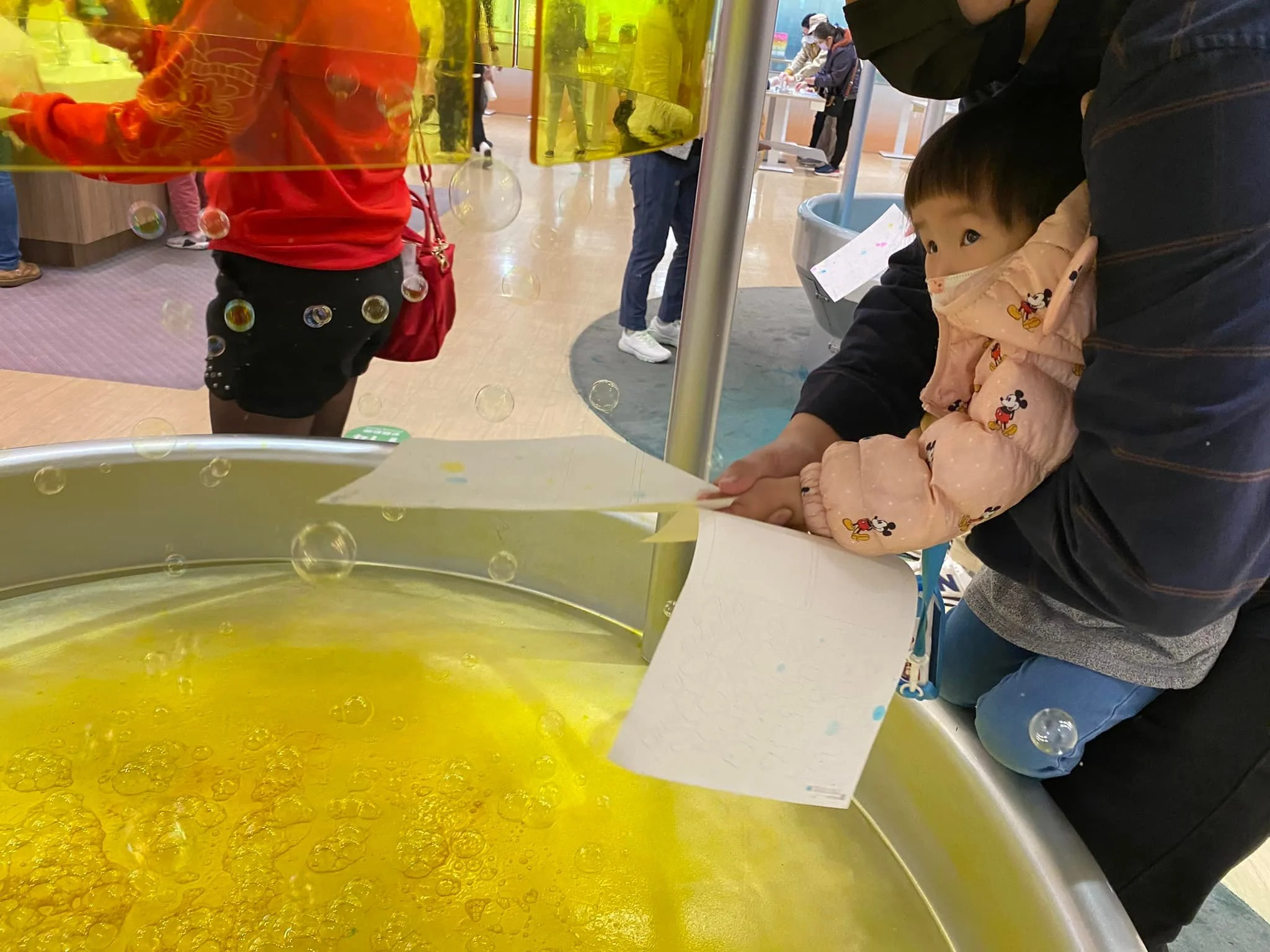 購票就送DIY 兩隻彩色筆,去過不少觀光工廠,覺得雄獅文具很用心,用泡泡機吹出來上色做泡泡畫給大家上色,零失敗又有創意,上色完後拿來作為彩色筆的包裝DIY。彩色筆也須我們自行組裝,可以自己選色填充,還可以混色呢,非常好玩!(兩歲的干貝也能幫忙填色),飛魚外公外婆設計自己的彩色筆包裝玩得比小孩還用心~