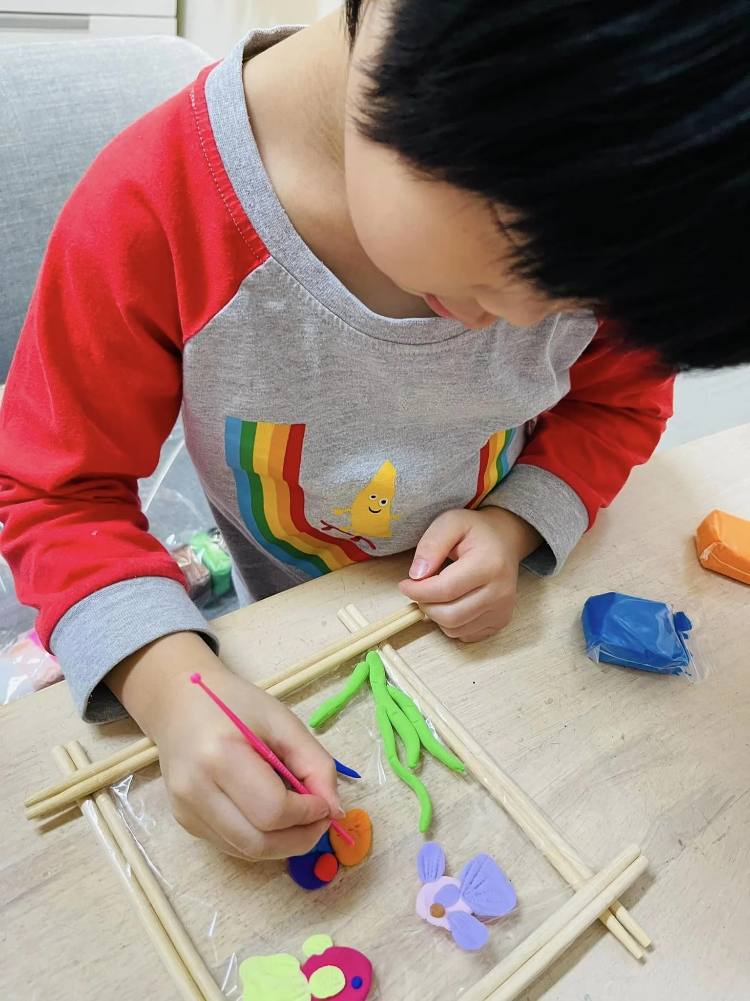 媽媽事前準備:把竹筷子黏成一個框,透明的底,媽媽自己覺得這樣很好看,哈哈。