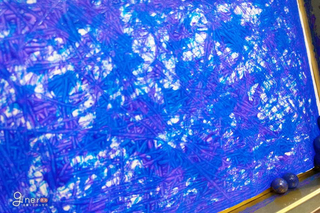 這次冰山的背景畫法是用滾珠畫來完成,滾珠畫大部分都是看到彈珠先沾顏料再放在畫紙上,其實直接將顏料擠在紙上,然後放上彈珠,這樣滾法呈現的效果很不一樣
