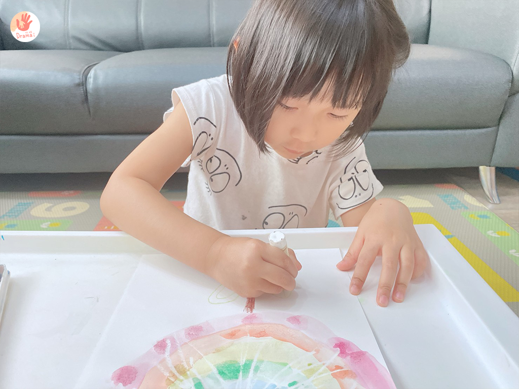 我和孩子玩DIY前會自己先畫好一張示範圖,也可以事前知道哪些是要注意提醒的部分,側著看就會很明顯看到白蠟筆的線條,我在手作時就跟女鵝說要畫像煙火放射,她這樣比較有一個概念和畫面在。