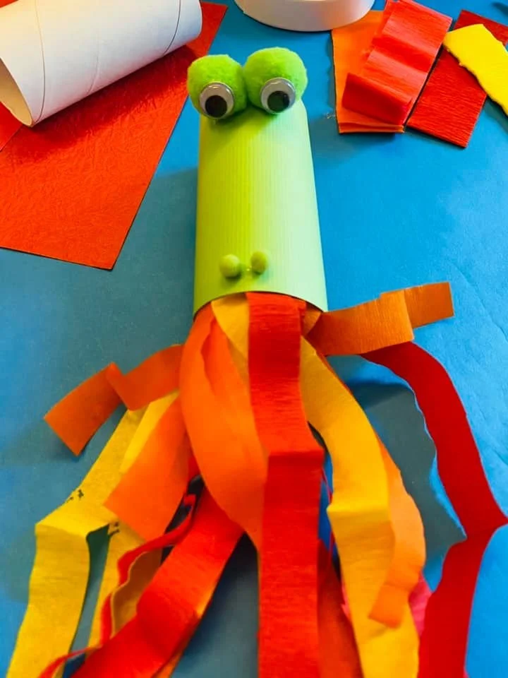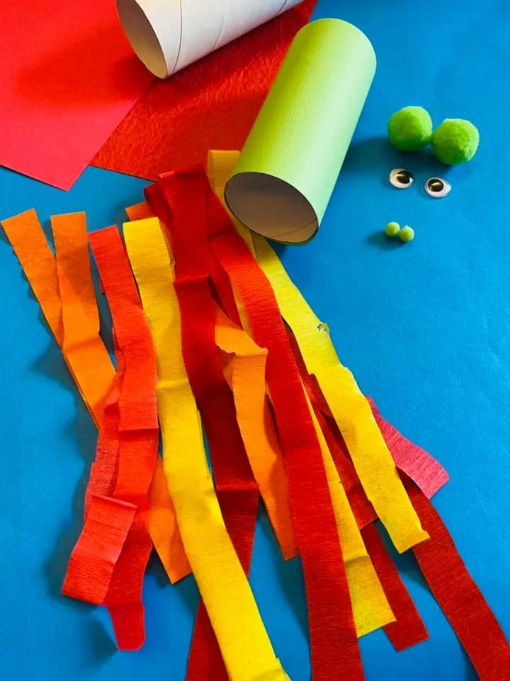 廚房紙巾捲筒半個、色紙、皺紋紙、剪刀、膠水(雙面膠)、毛球、活動眼睛