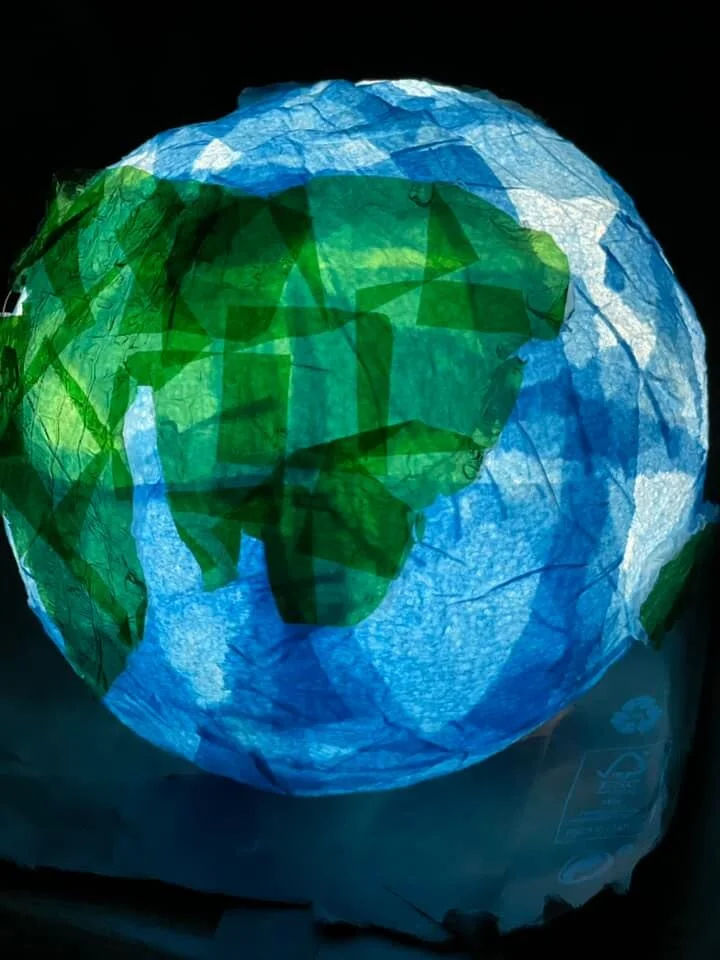 8. 再用玻璃紙剪地球陸地形狀貼上,地球燈罩就完成啦!