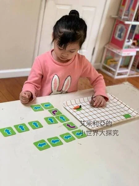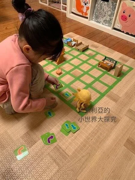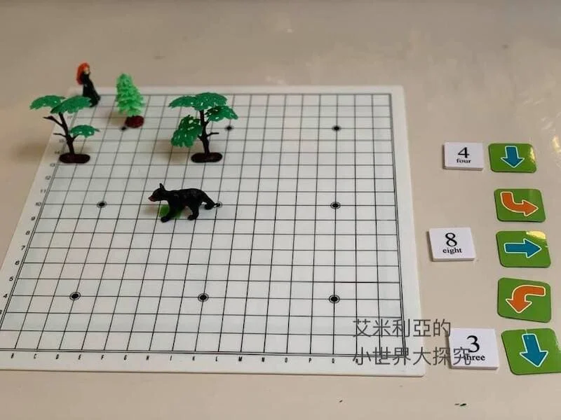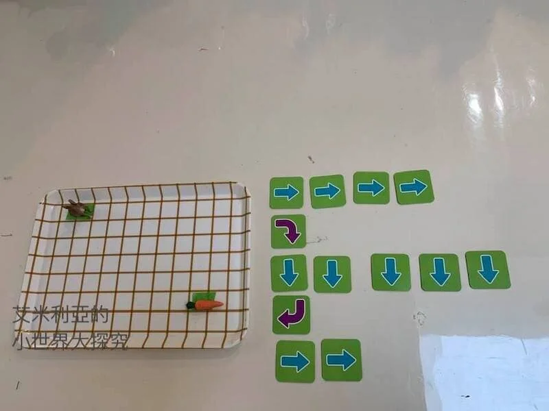 我發現家有一個格子盤,我覺得用格子盤玩coding也不錯,在格子盤上排出不同的箭頭,讓小孩邊看「程式碼」邊走走,看看是否能夠發現裡面的錯誤。