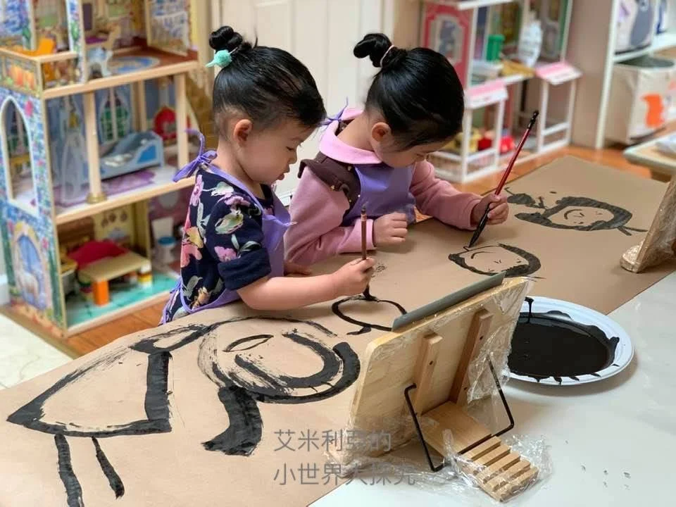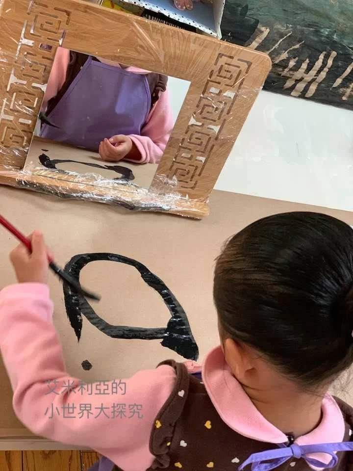 我先拿鏡子讓艾米與利亞觀察自己,他們直覺拿起筆畫在鏡子上,也是一種不錯的自畫像。