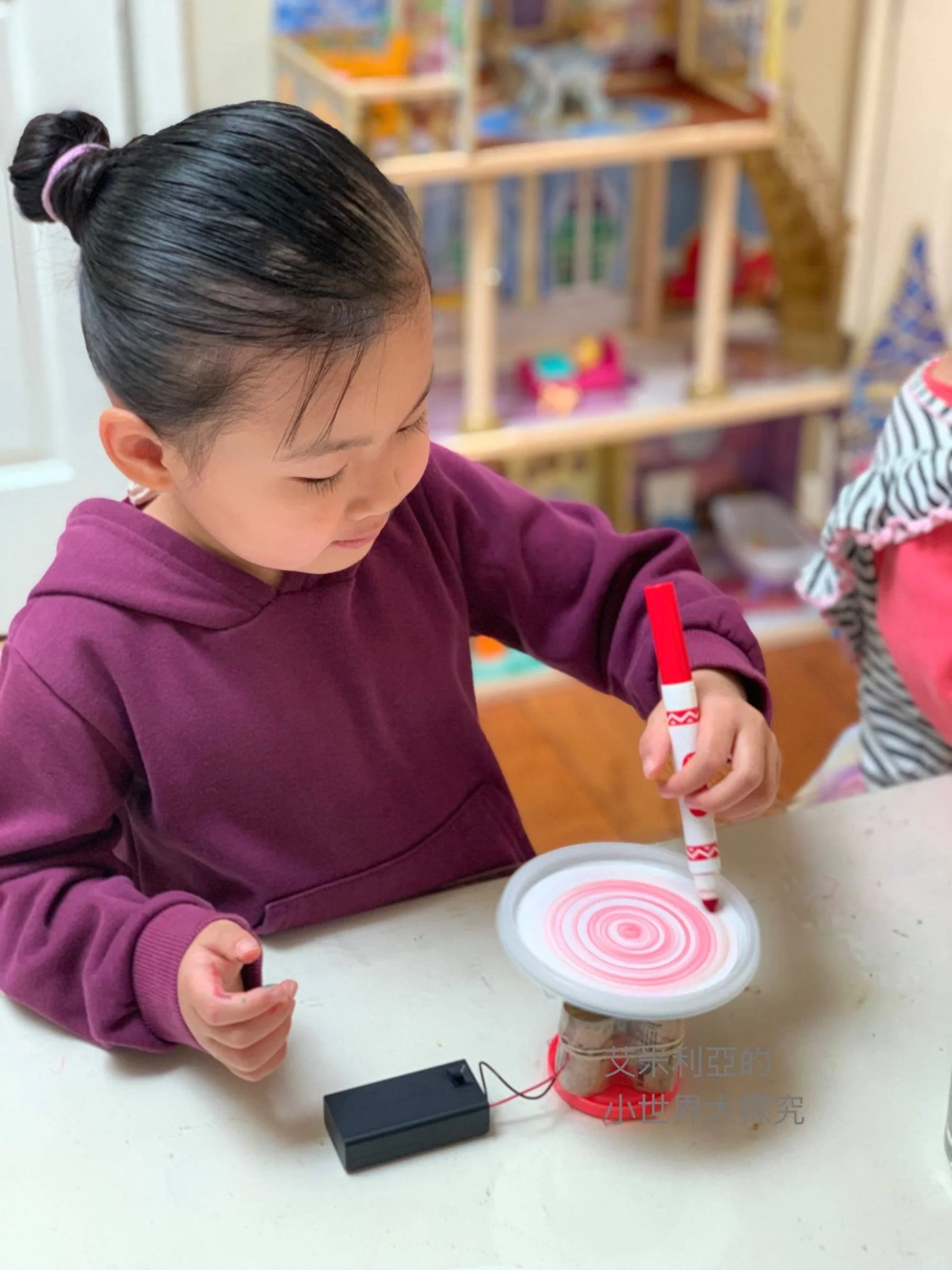 艾米很喜歡玩,但是幼幼班的利亞對馬達聲有一點害怕,只敢在一旁看艾米玩。