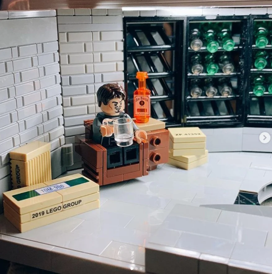 嗯嗯!今天成果不錯,喝杯蔬菜汁開心一下。咦?電視上在講我耶! (中間有一些為了場景的表現用了樂宜樂custom的 ,還有一瓶酒是第三方之外,其他都是樂高元廠的,也特別說明。)