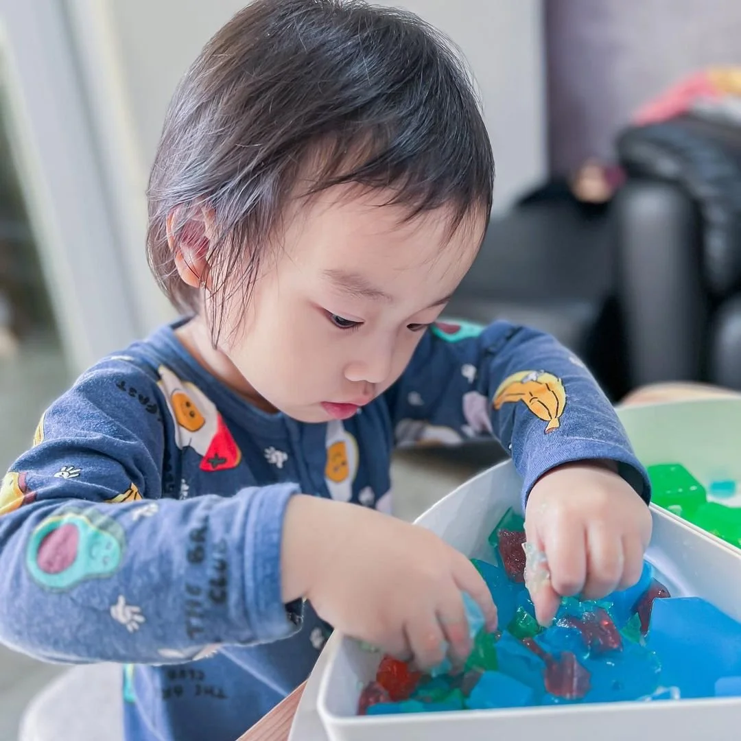 自從開始玩過菜燕之後,他們真心愛上這個觸感,不停的捏爆、搓揉,菜燕捏爆的感覺跟水晶寶寶很類似,擔心孩子接觸水晶寶寶的家長也可以用菜燕取代看看。