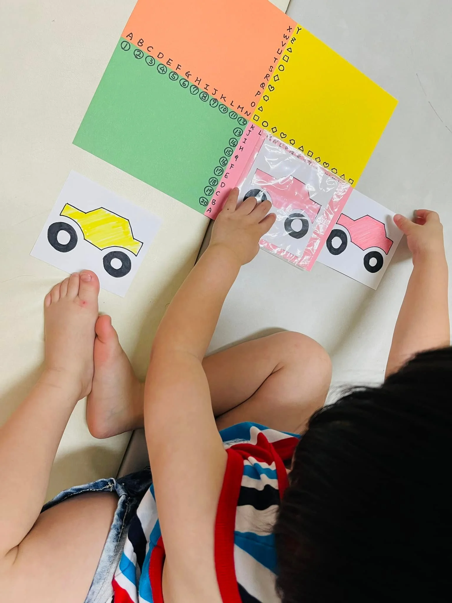 讓怪獸卡車好像在色紙上奔跑,不斷的改變顏色,讓Nyle 覺得好新鮮有趣!也在認位置的同時增加A、B、C,1、2、3,各種形狀的認識。