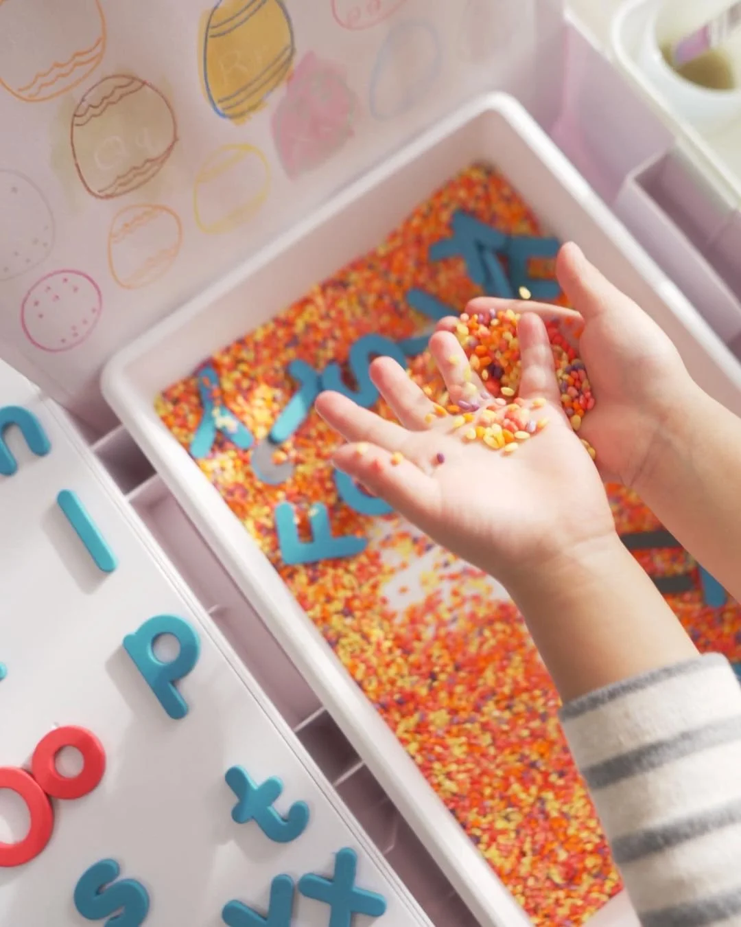 這個字母學習搭配水彩畫與感官盆的玩法,是幫助孩子在學習中視覺與觸覺刺激,使他在找尋字母時因著感官刺激,進而使大腦對於所學的新知識產生連結。