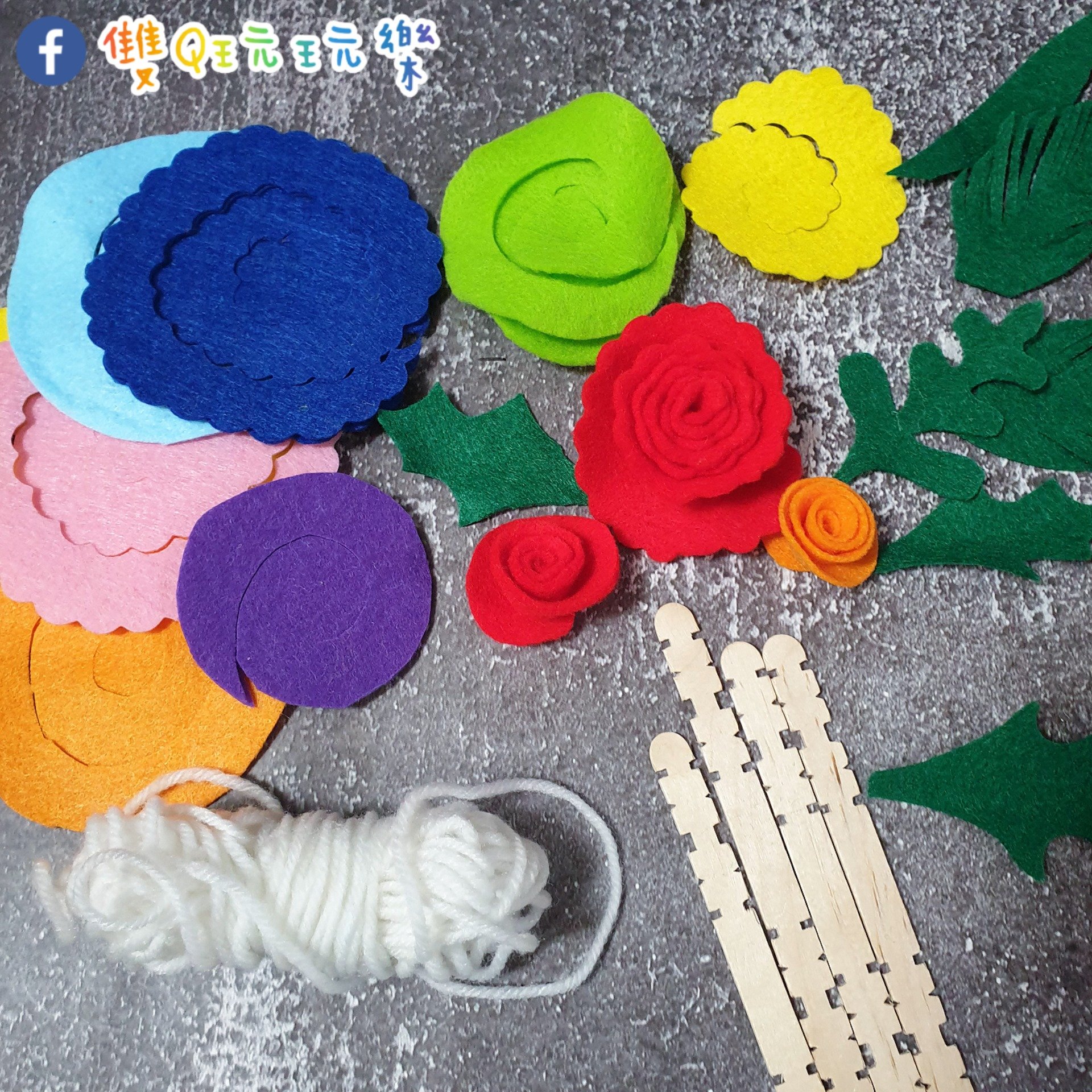 花朵的部分使用家裡剩下的不織布碎布剪圓,意外比紙張來的好做許多,作法其實很簡單,就是剪個圓形後,再剪螺旋紋路,接著由外往內開始捲起最後固定在中心處就好了~