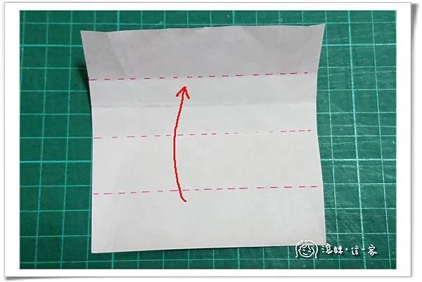 攤開後,就會出現3條摺痕,再把色紙由下往上折到第一條摺痕。