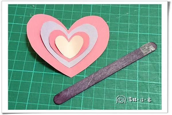 3、再將這四個愛心由大而小,由下而上的以雙面膠在中心點黏貼固定,